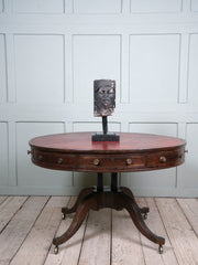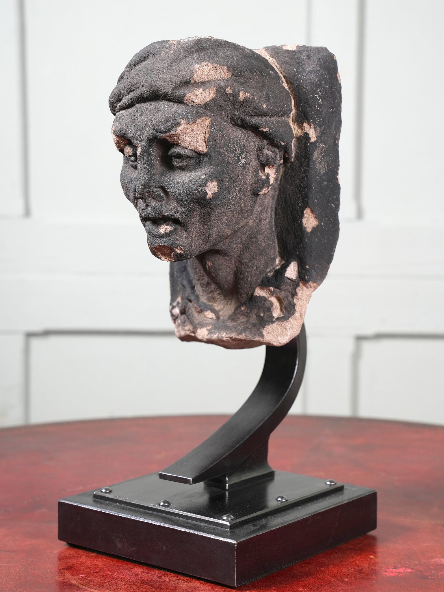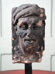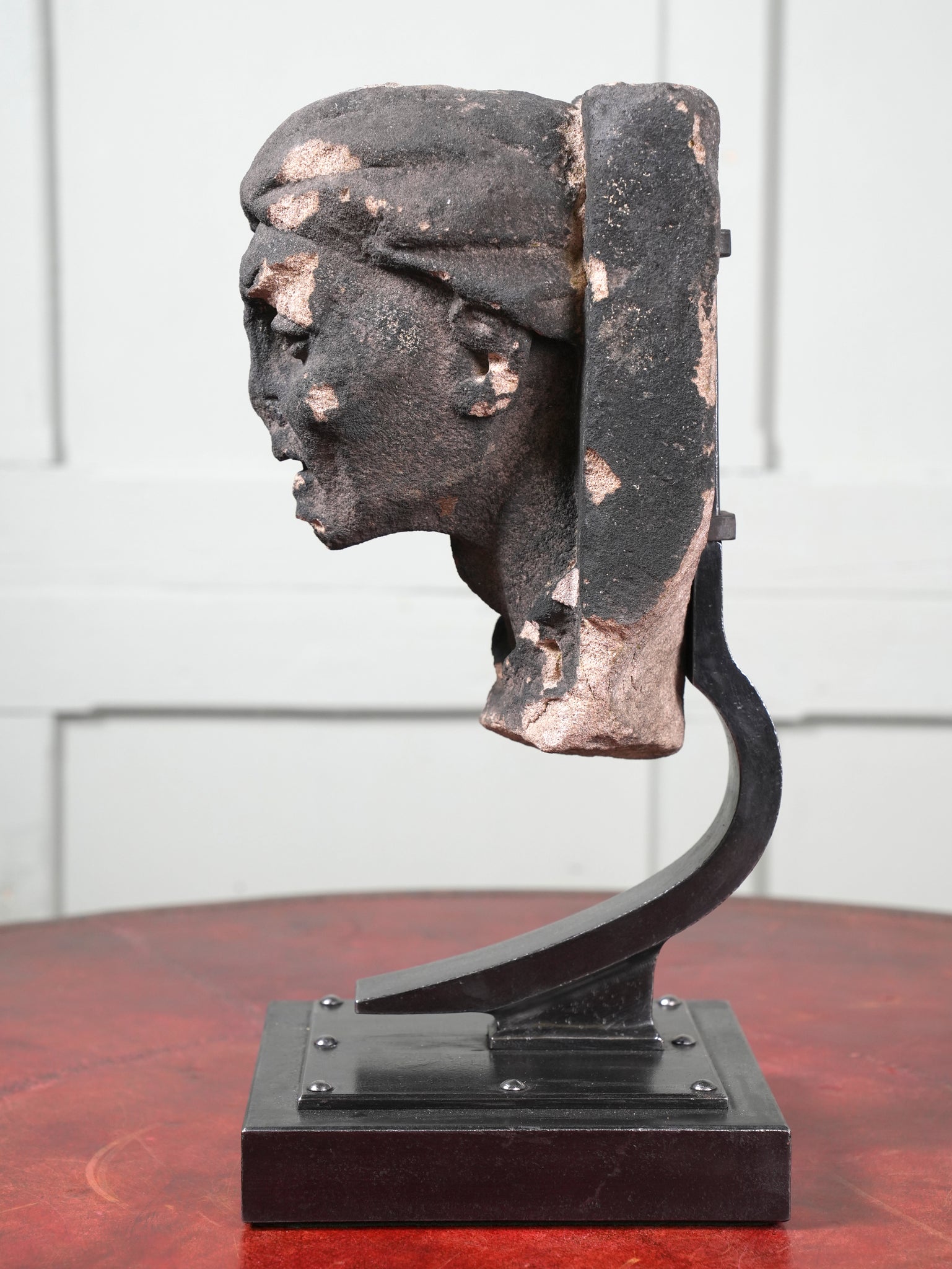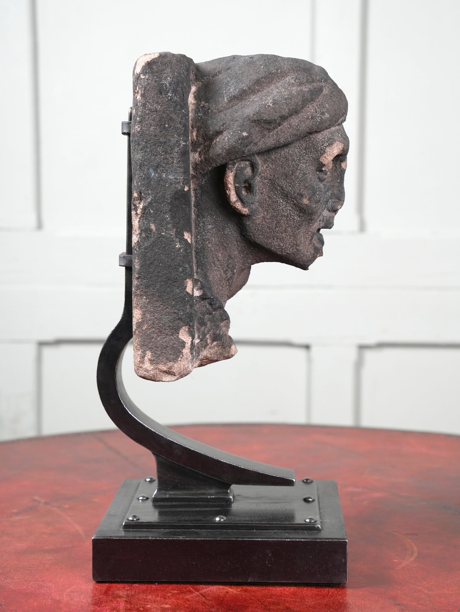 The male looking downwards, his head wrapped in a cloth or cap, set on a wrought iron museum mount.