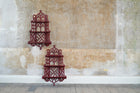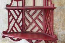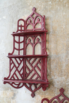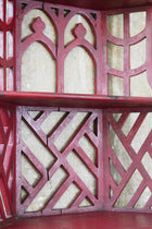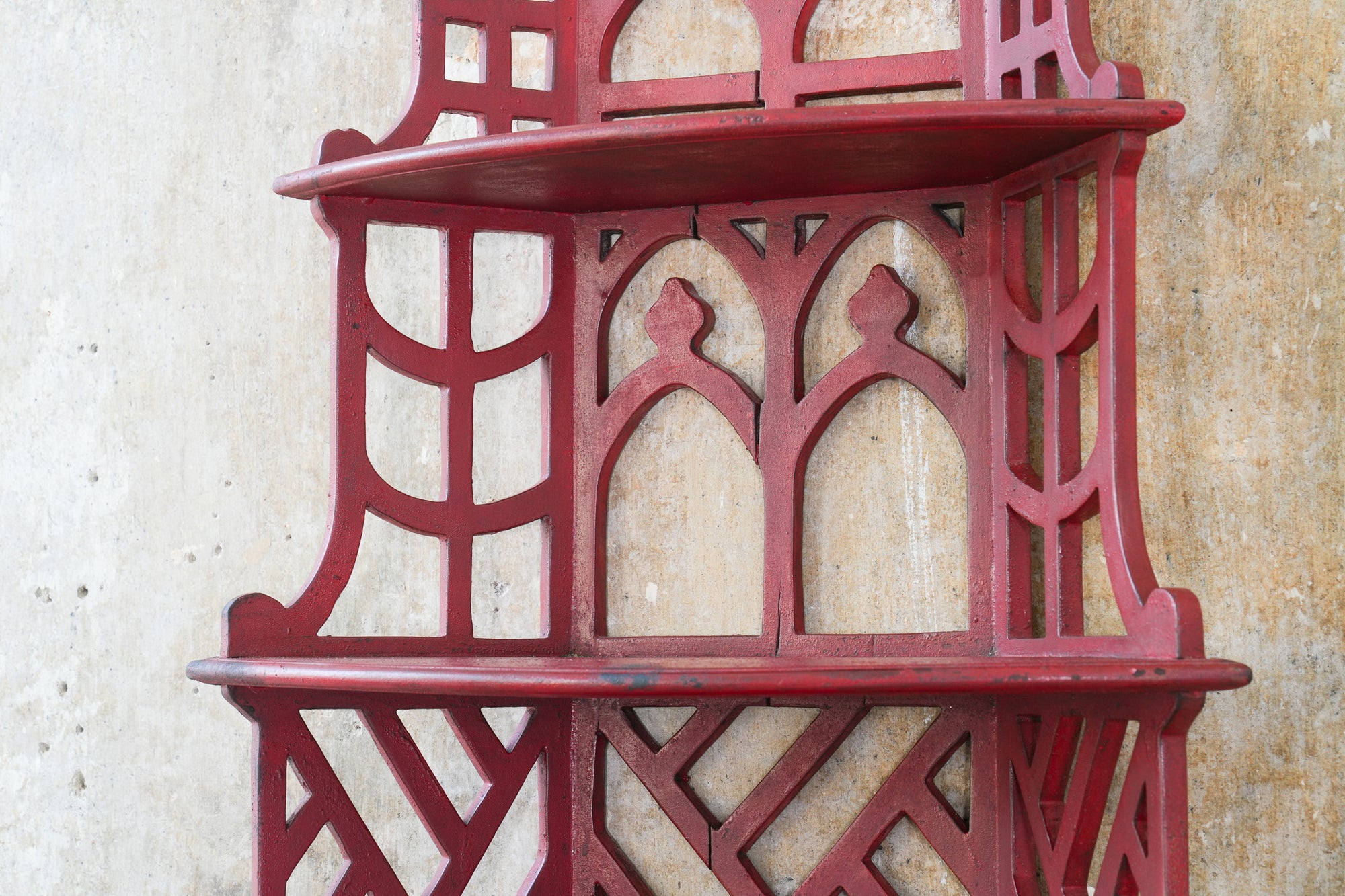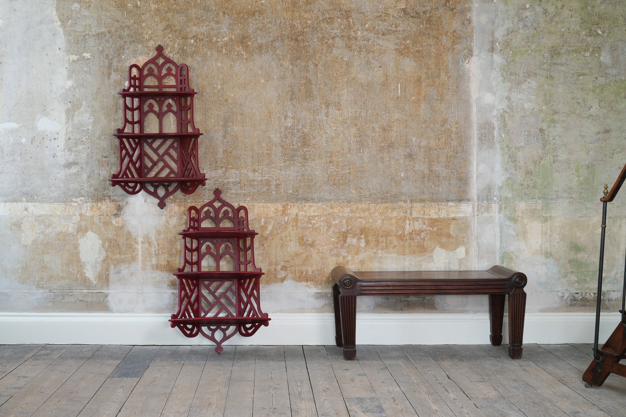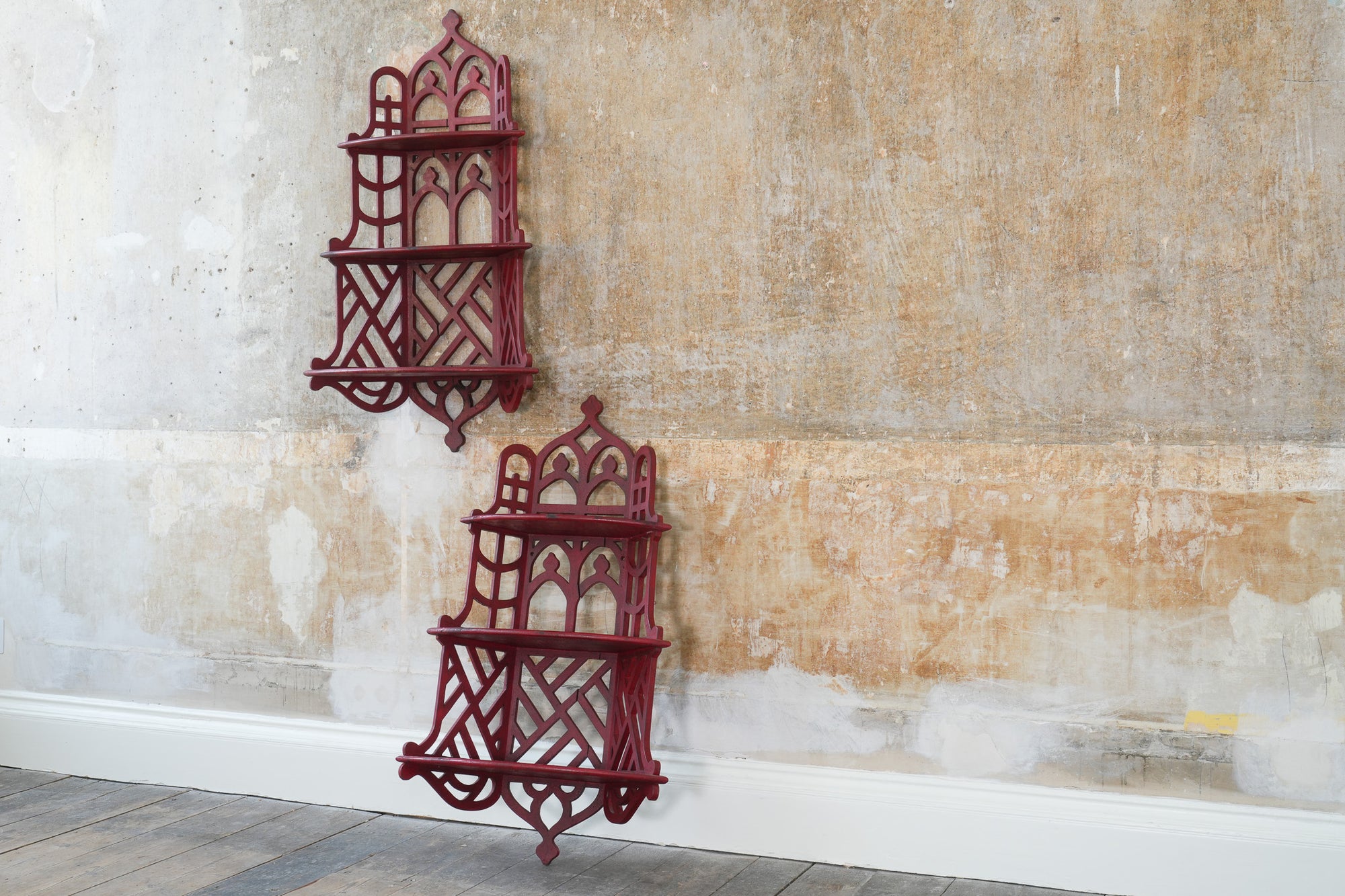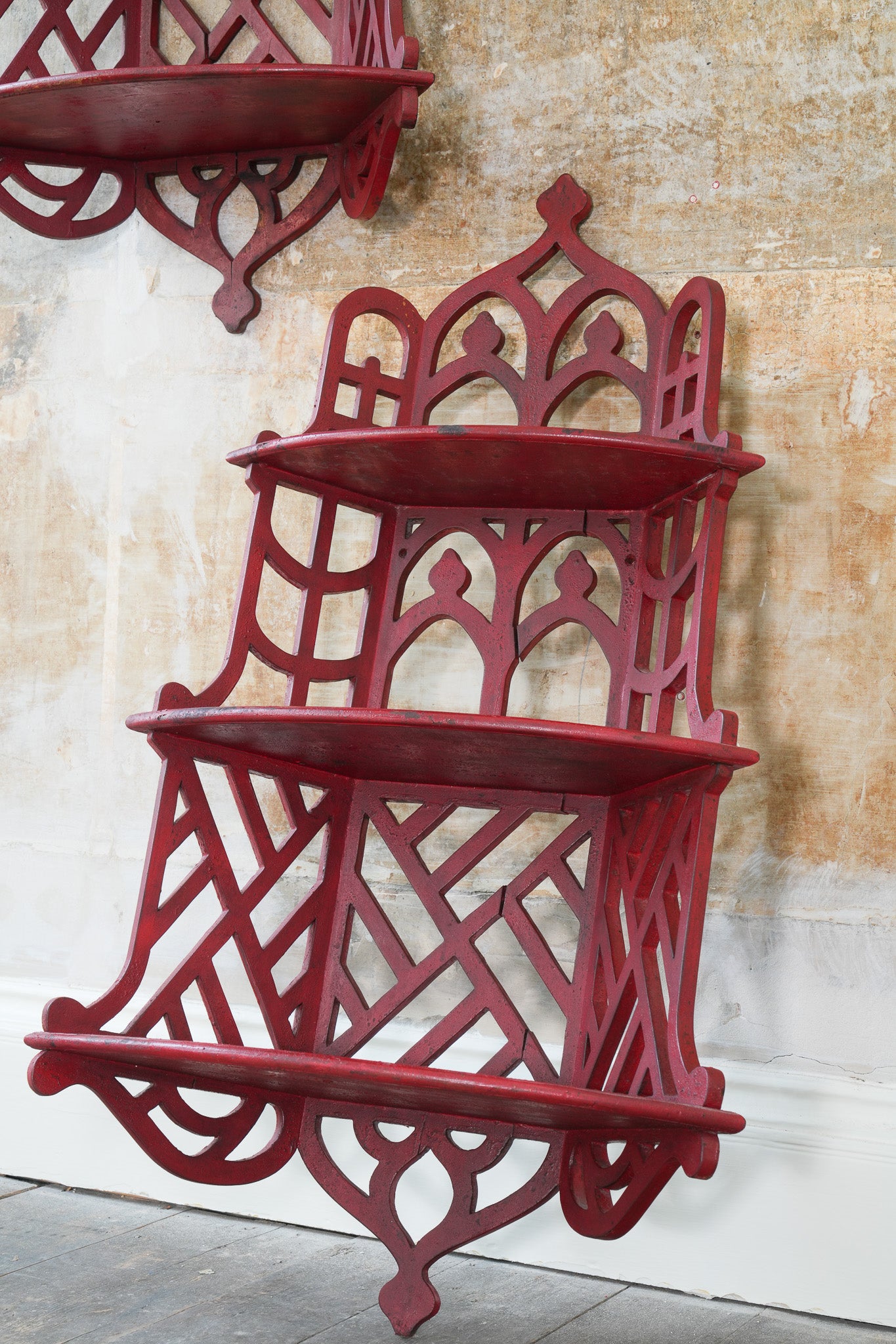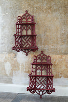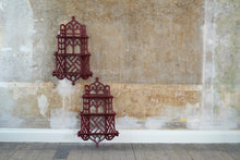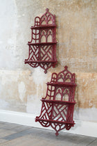 A pair of large painted mahogany hanging shelves in the Chinese Chippendale manner.
