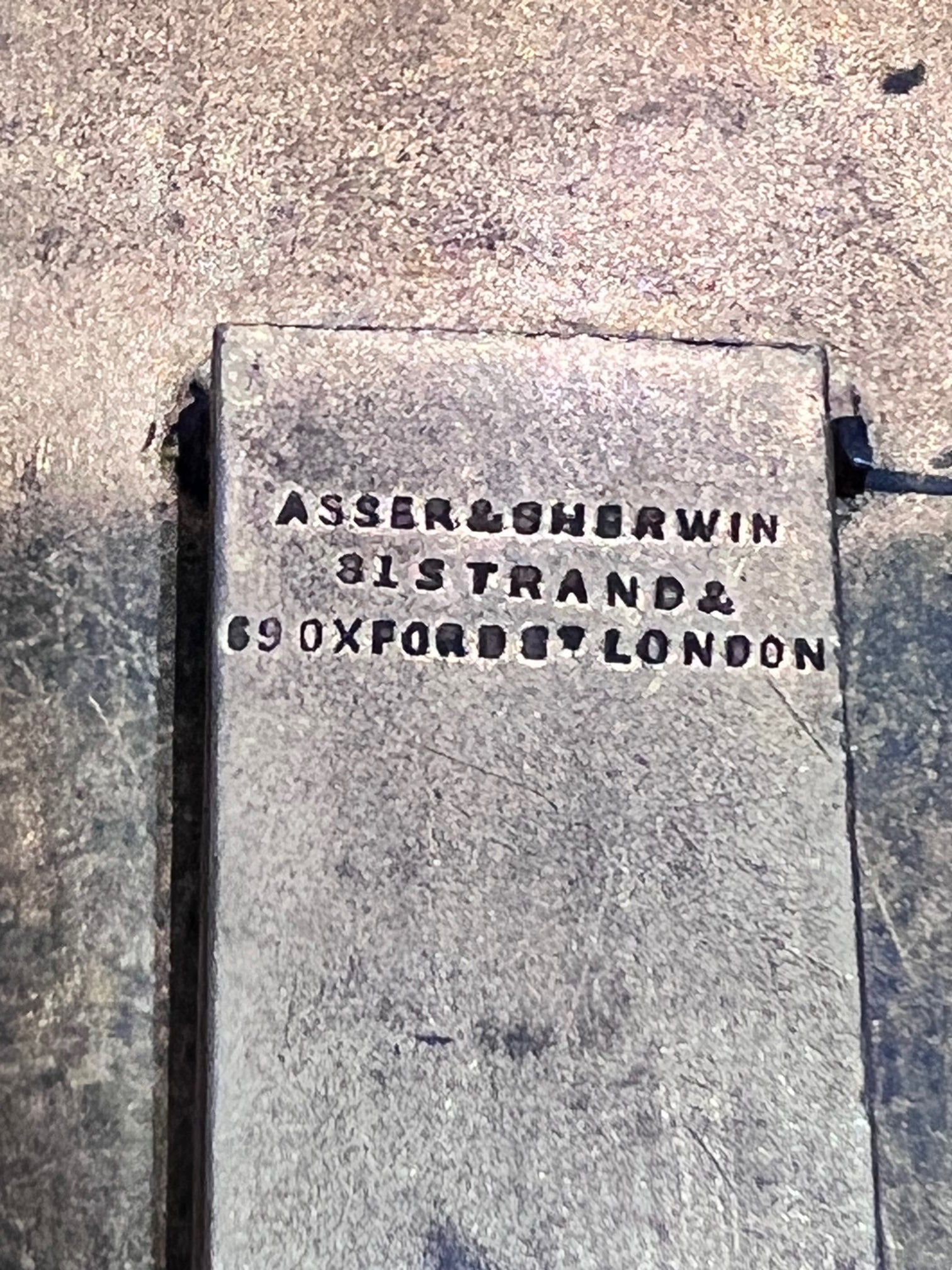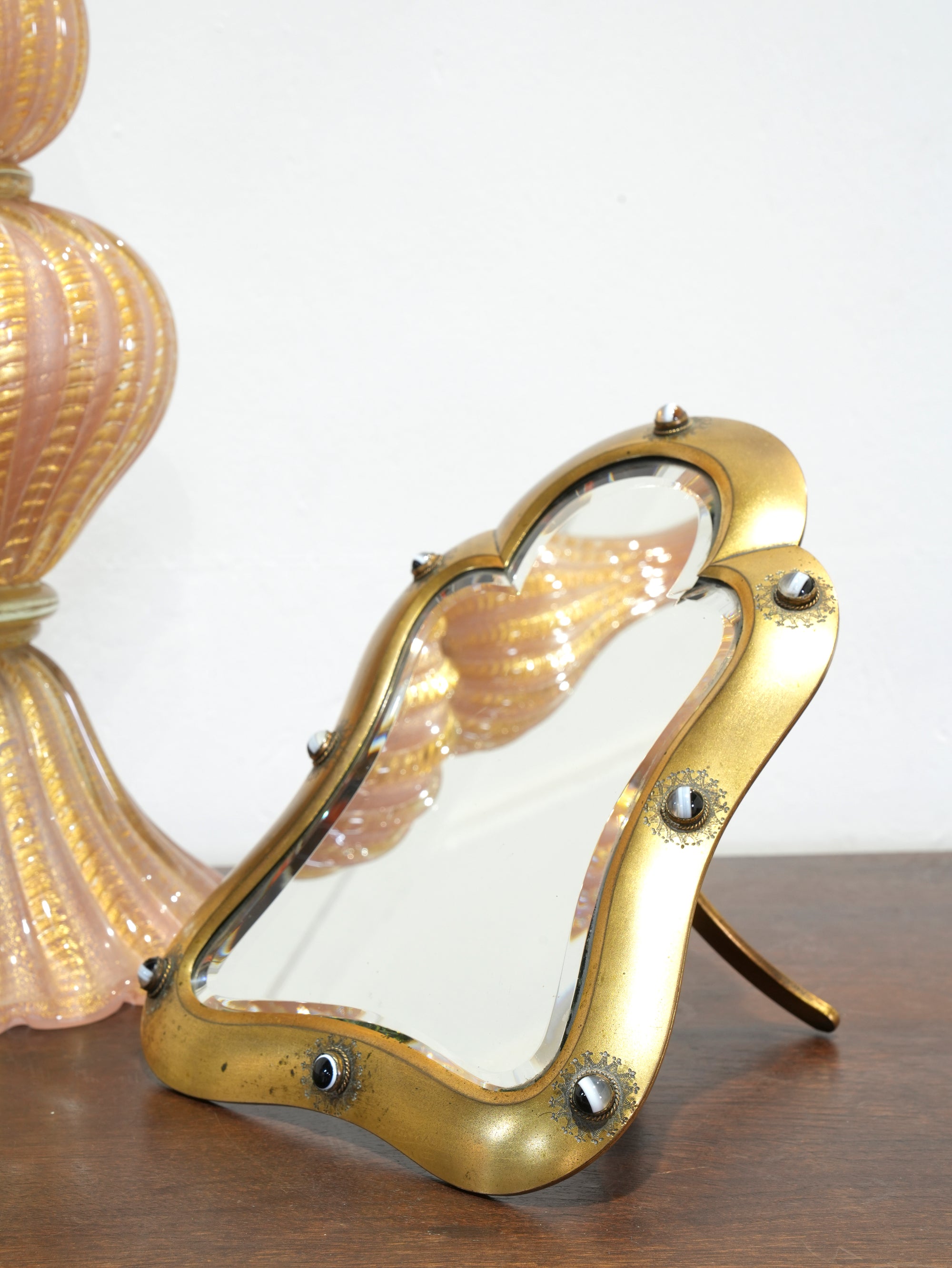 A brass framed dressing table mirror, original bevelled plate, the surround set with banded agate cabochons within engraved surrounds, the easel back marked “Asser & Sherwin, 81 Strand, 69 Oxford St, London”.