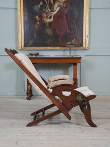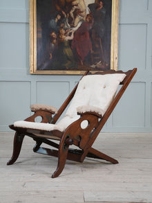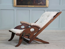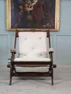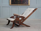 An adjustable and folding teak campaign chair with upholstered sling seat.