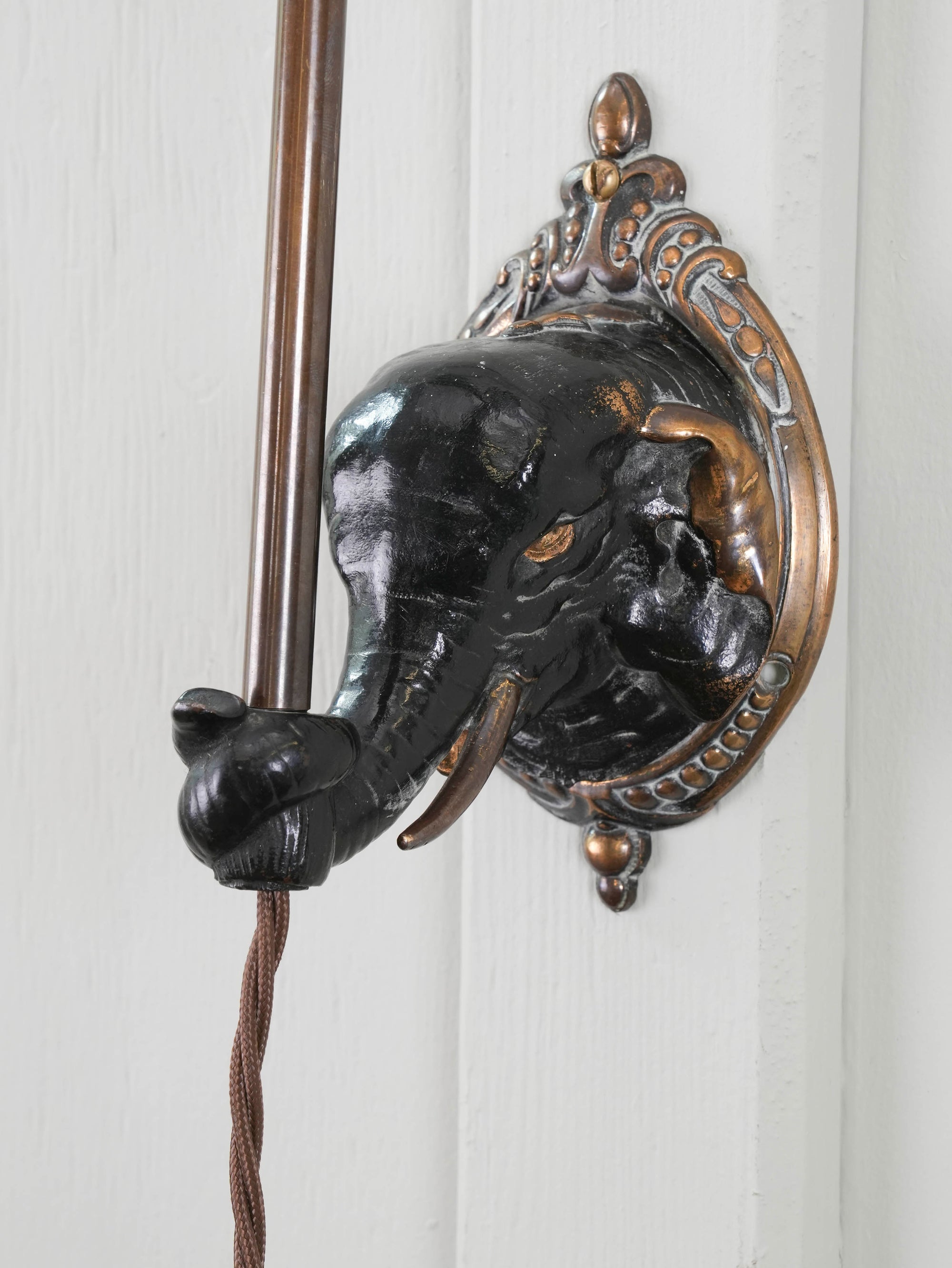 Ornate oval wall mount behind the elephants head, the trunk holding a lamp stand so the shade sits above the mount.