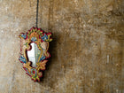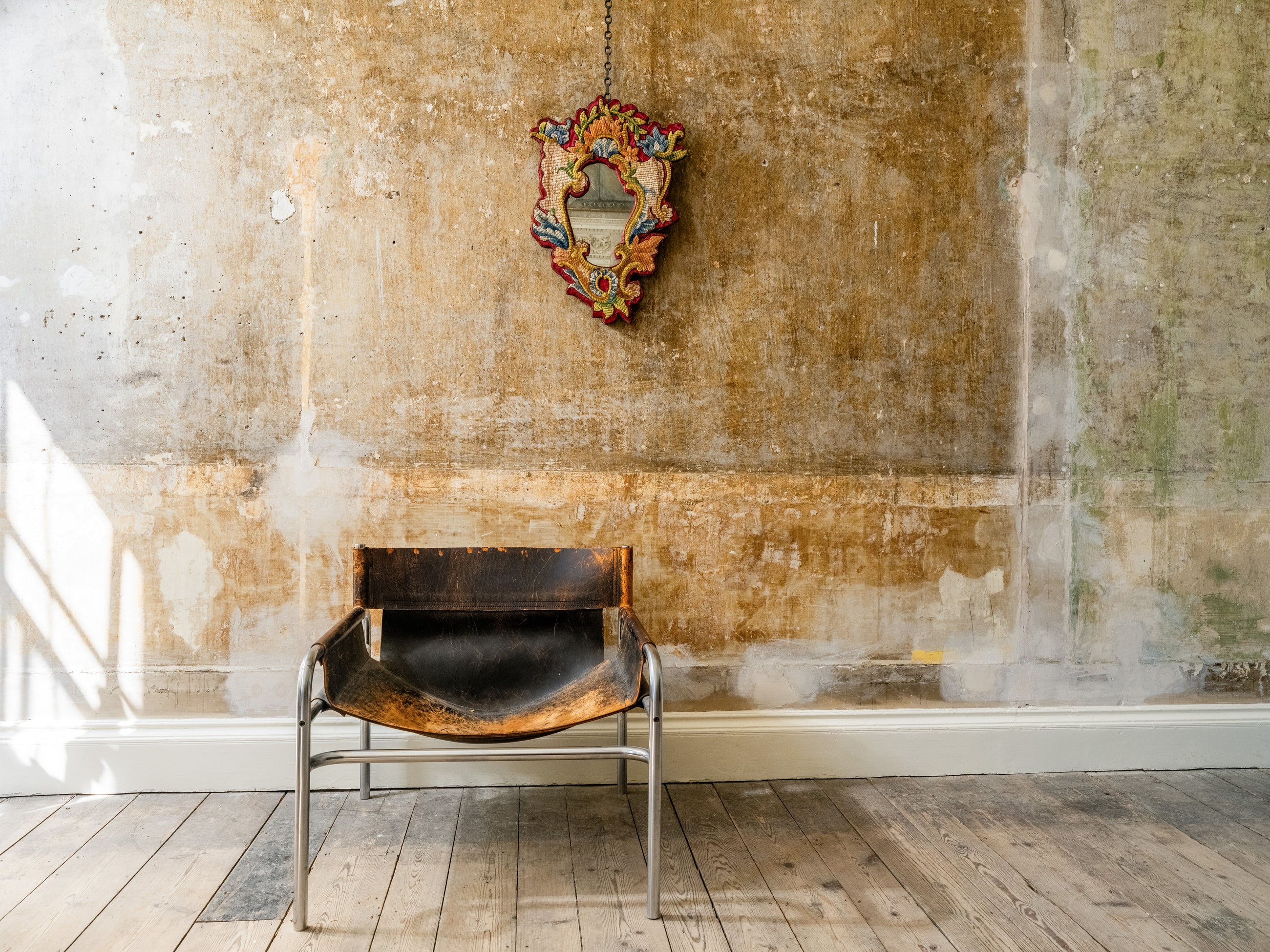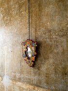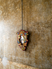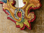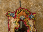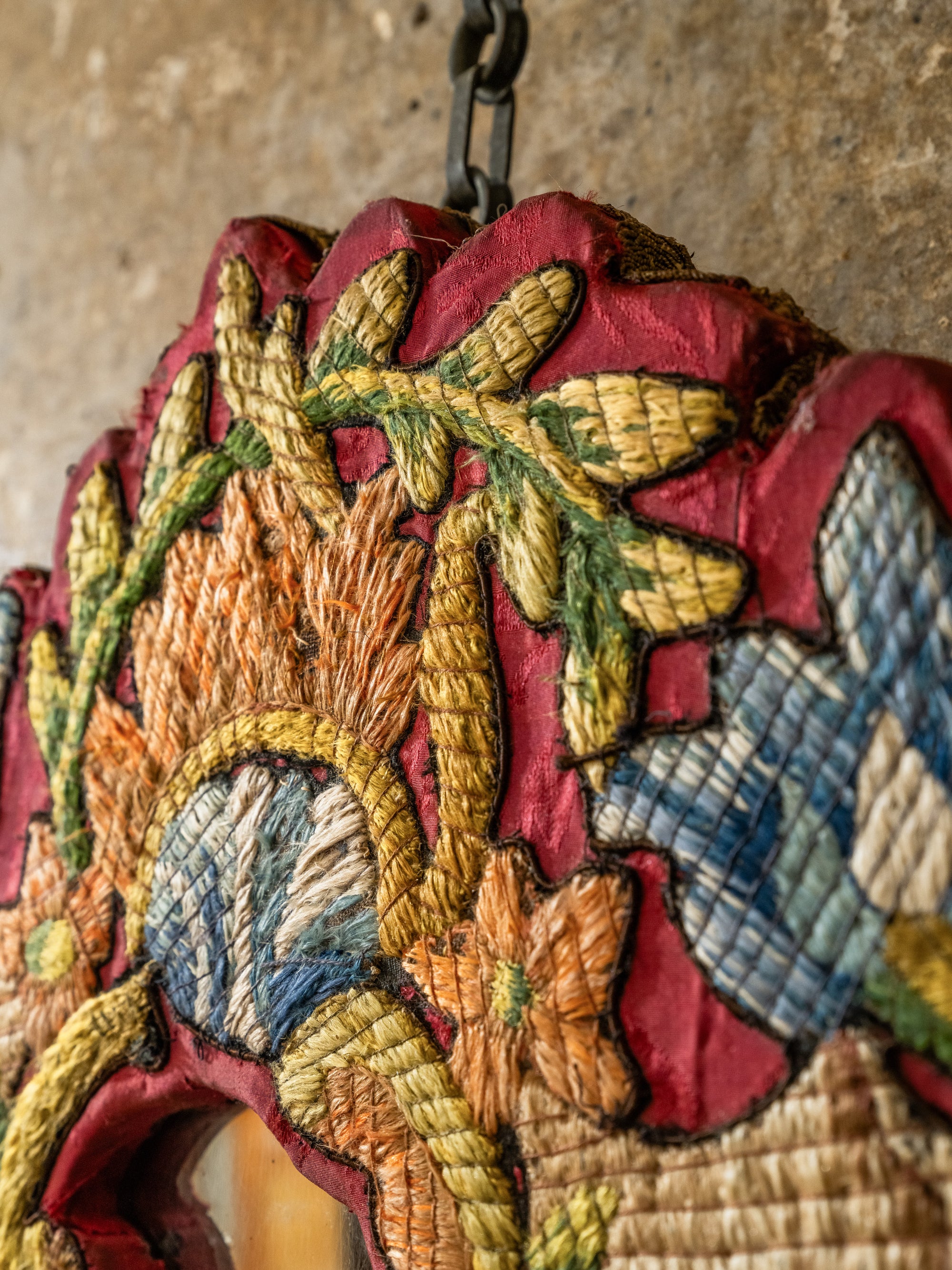 A Rococo form wall mirror produced using remnants of 18th century silk 'floss stitch' tapestry fabric and a late 19th century mirror.