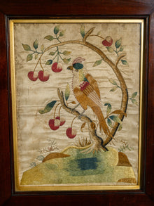 An 18th century silkwork of an exotic bird, possibly a Himalayan Monal set in a mahogany frame with gilt slips.