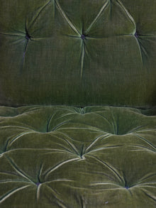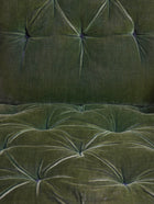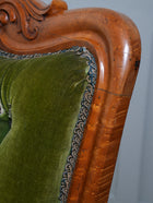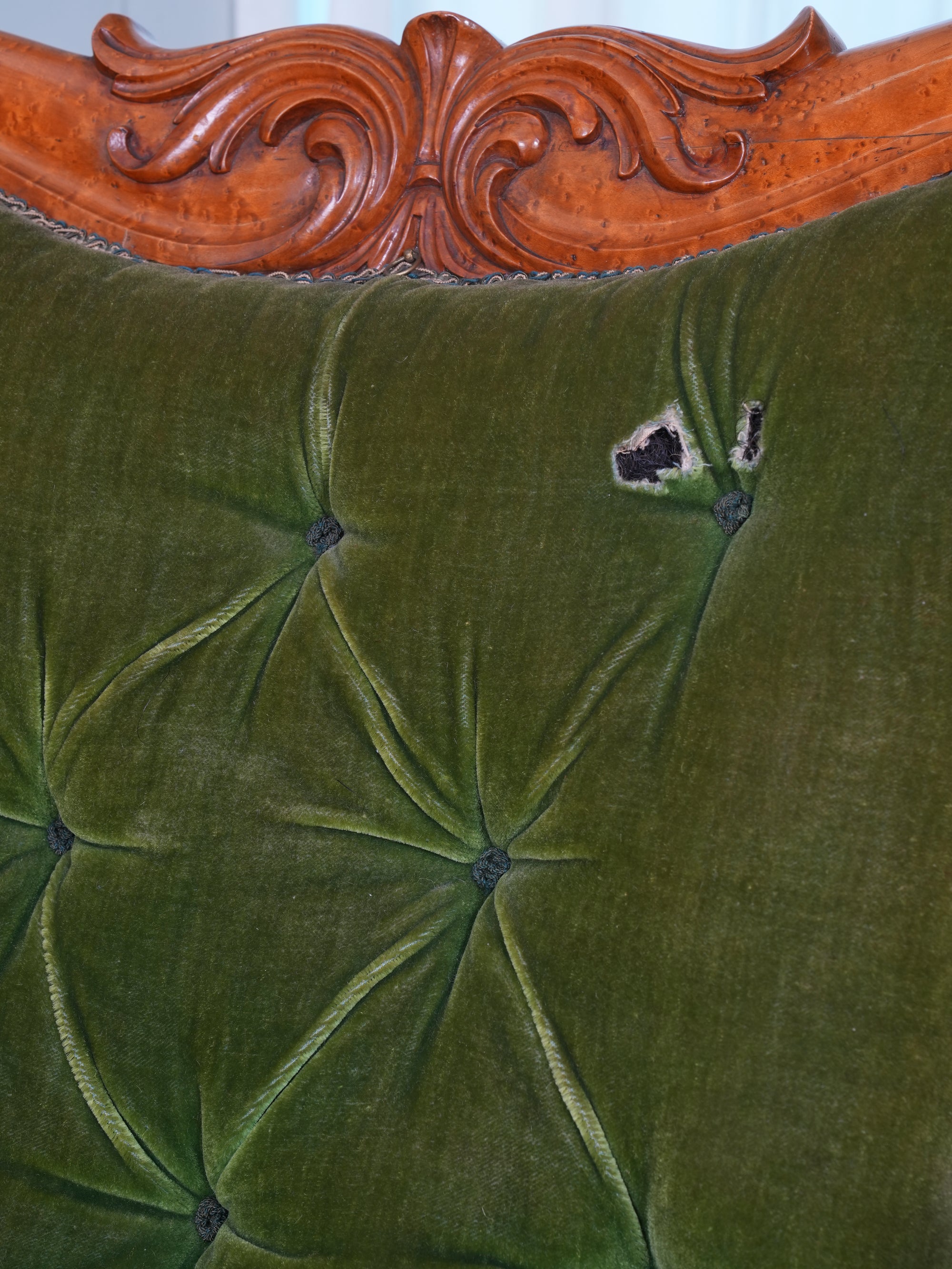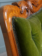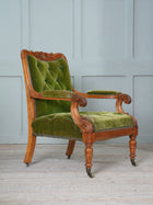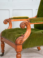 The carved crested rail above an upholstered back rest, the down swept armrests above particularly crisply carved supports, buttoned seat, raised on turned front legs, all original brass casters.