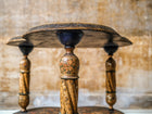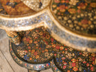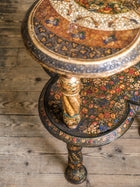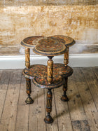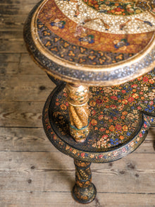 A Kashmiri polychrome-laquered side table of trefoil form with the under tier also profusely decorated with long tailed birds amongst a dense floral ground, The legs with unusual solid twisted sections.