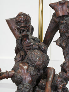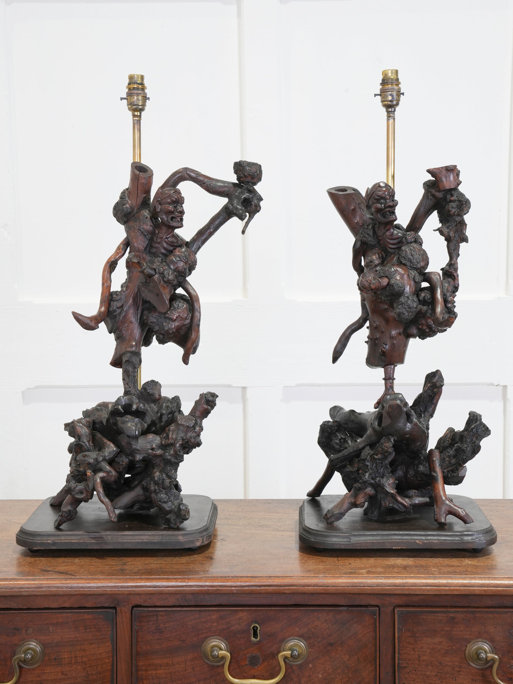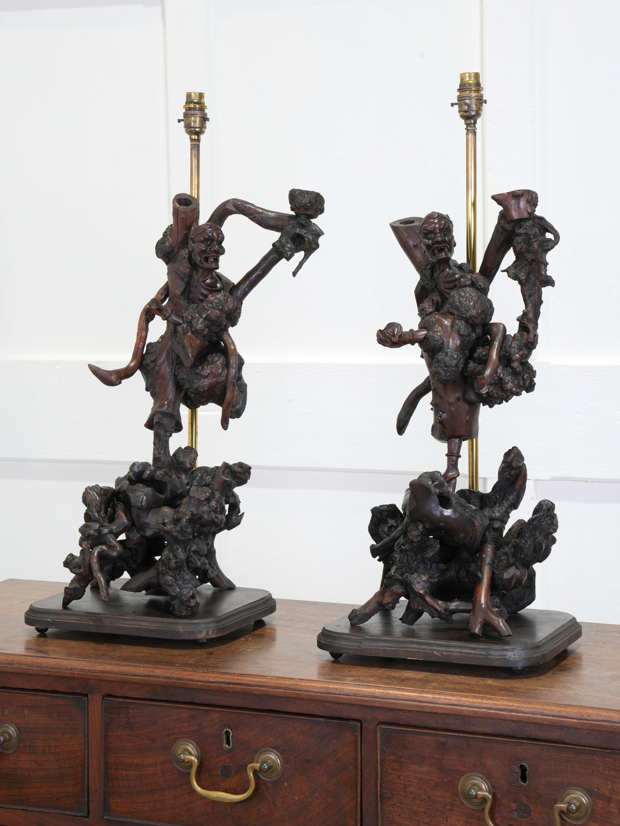 Each has a carved male demonic figure within the exaggerated hardwood root.