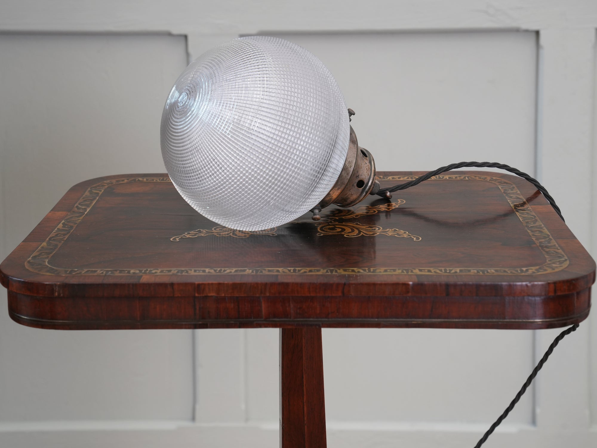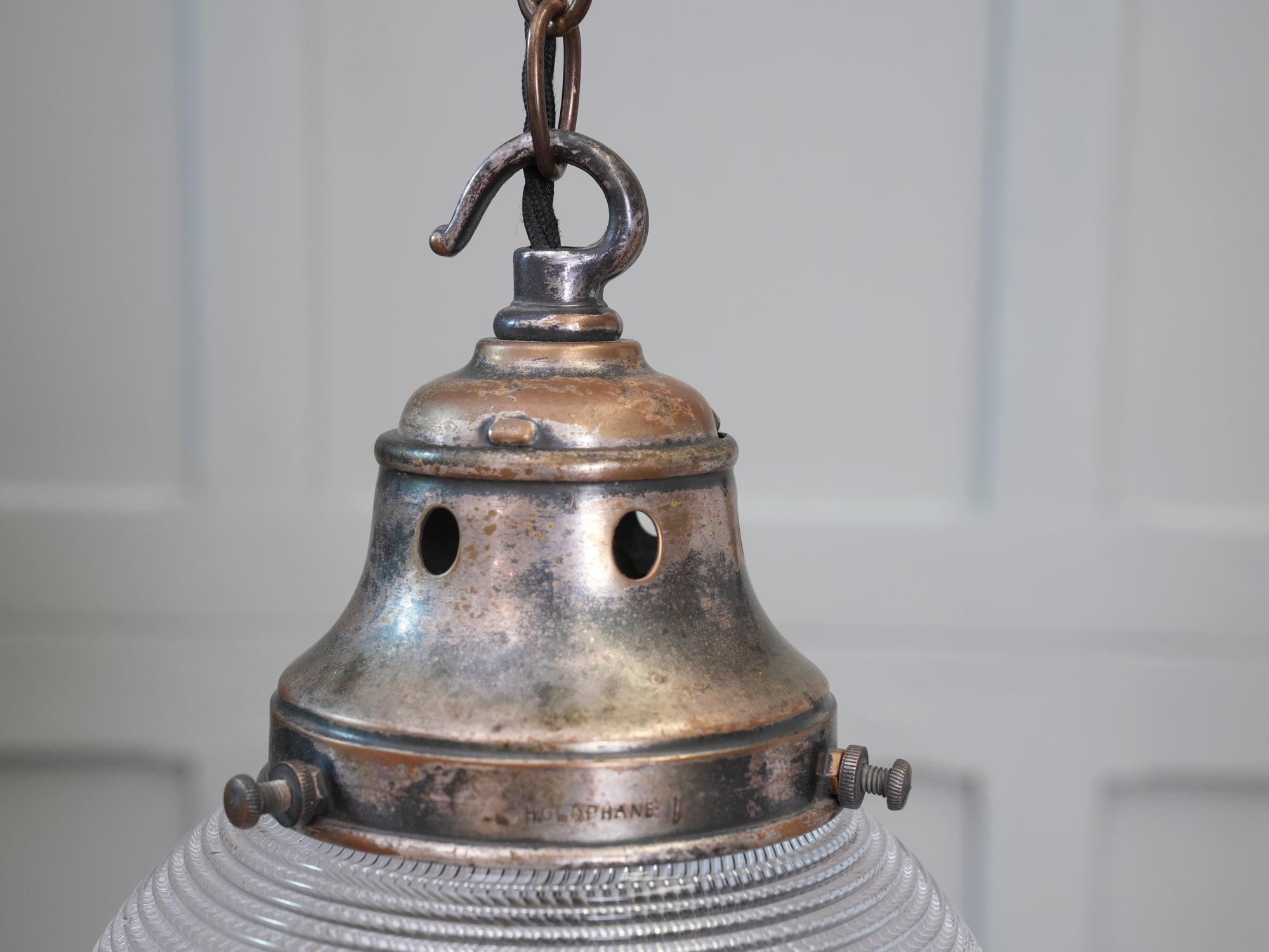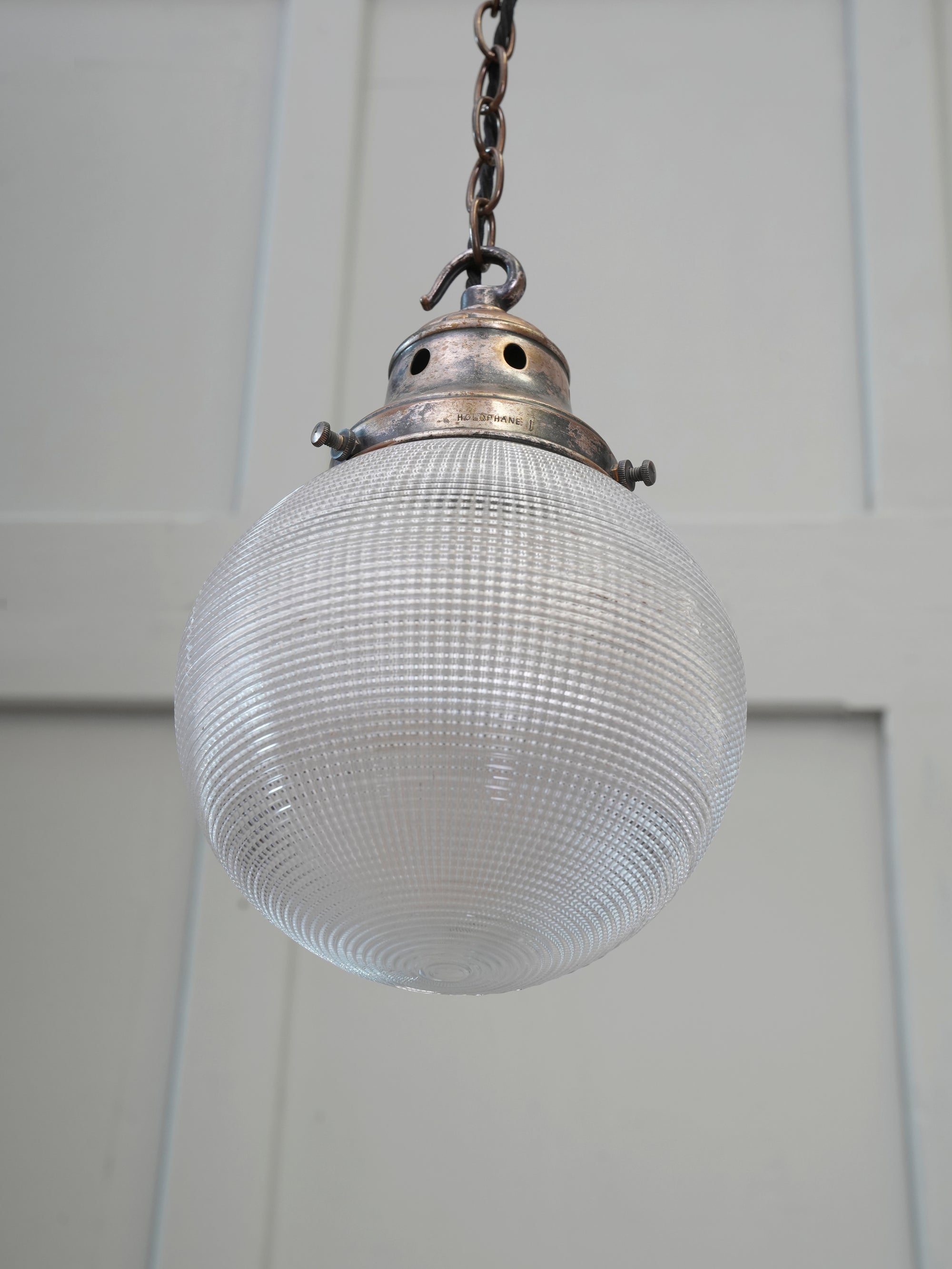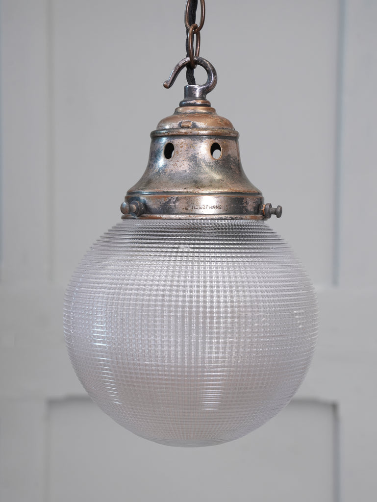 The worn nickel plated brass gallery stamped "Holophane", crisp prismatic glass globe.