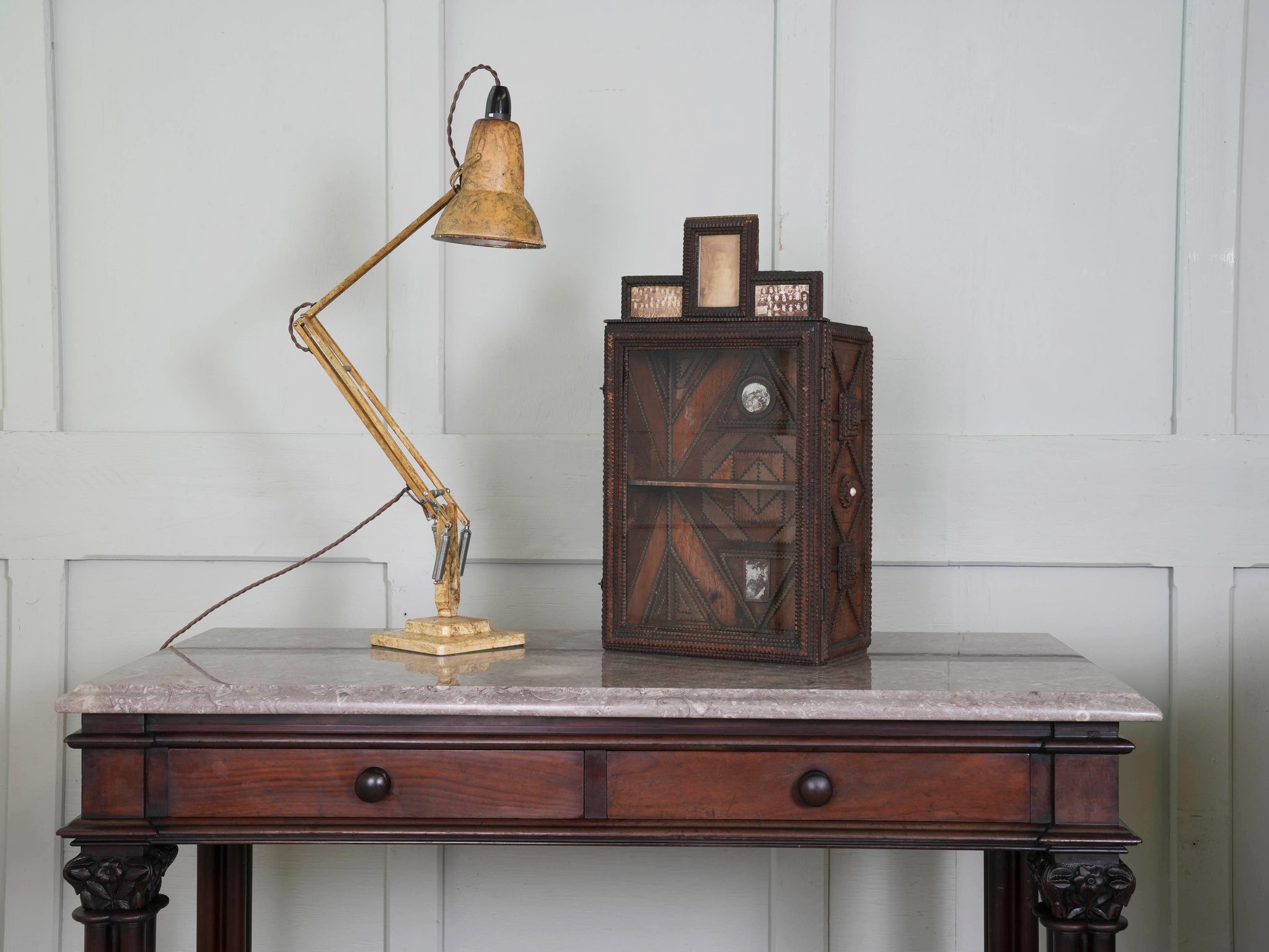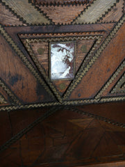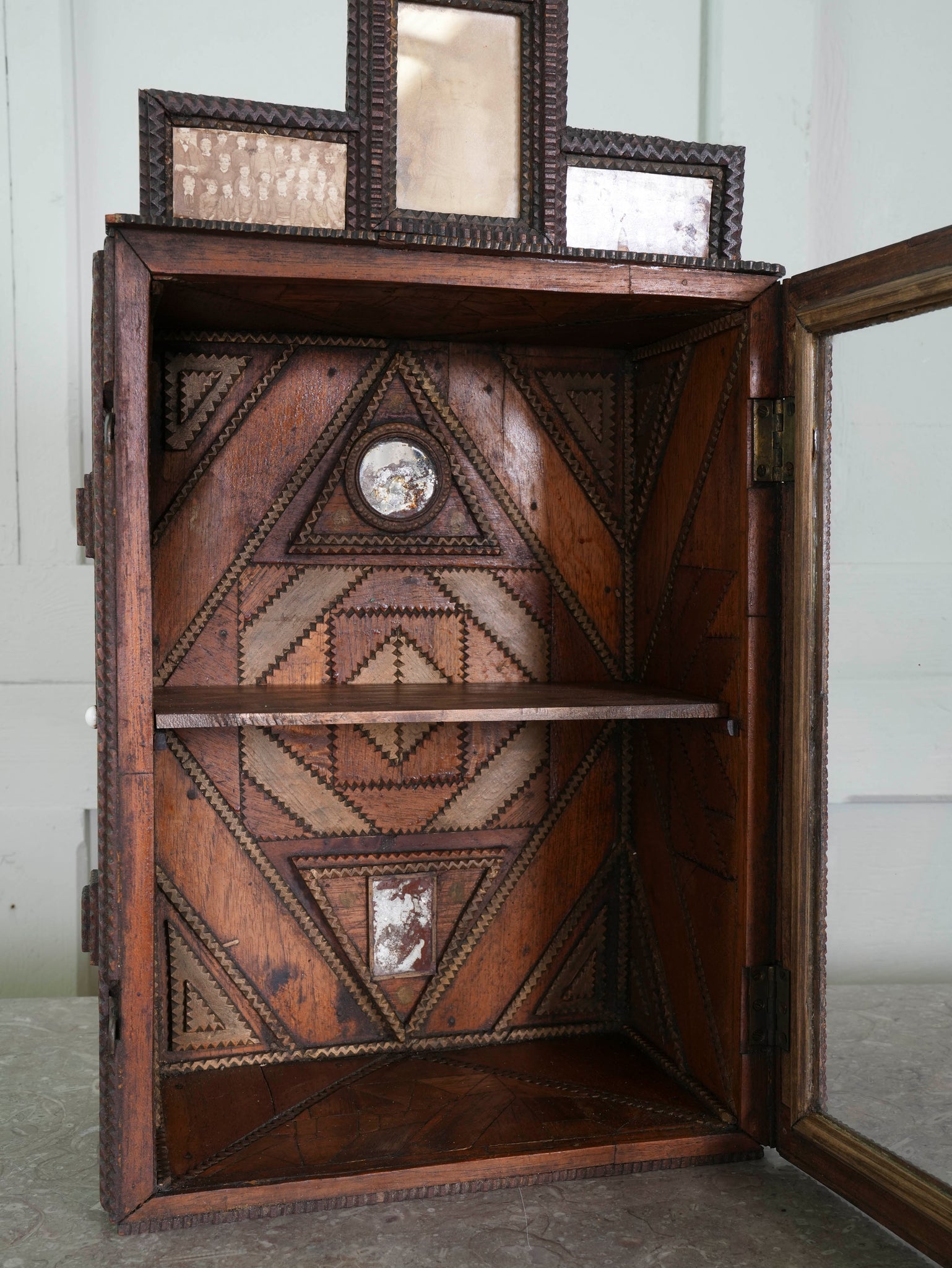 A highly unusual chip carved softwood tramp art Table or wall cabinet with a single shelf and patch work inlay and small mirrored sections behind the glazed door, the cresting has three frames holding black and white photographs.